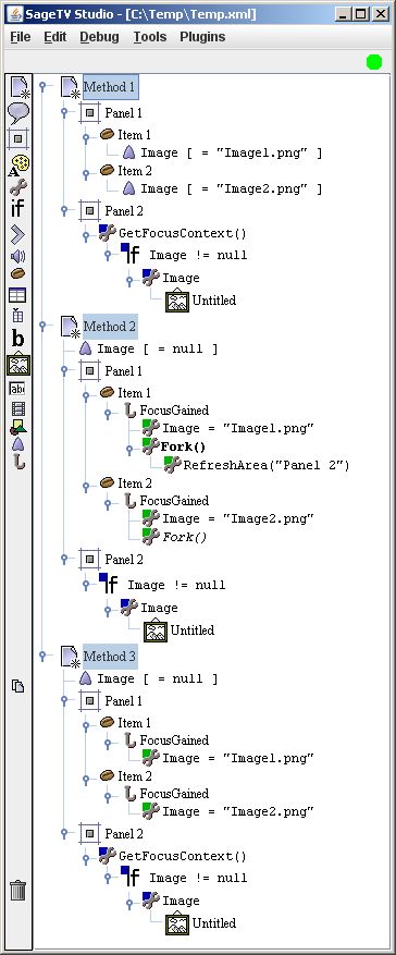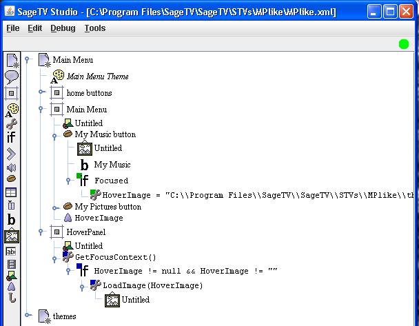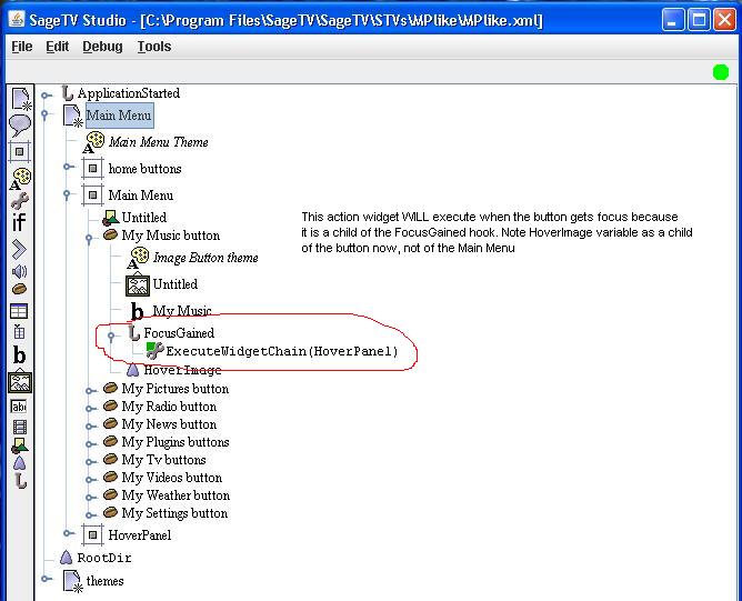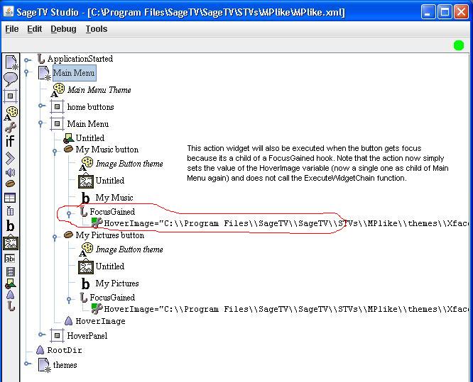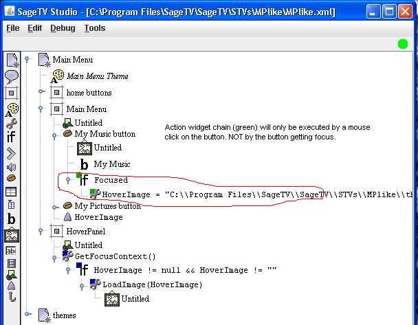 I thought I had this coded correctly, like what was described in this post http://forums.sagetv.com/forums/show...light=rollover but it wasnt quite there. Not sure why I would have to have a variable under each button if each button had an action widget to set the value of a variable shared by all buttons... I also assume you mean for the FocusGained hook to be in each button, how is this different from the "if focused" statement? Anyway, what I did was to put a "hoverimage" variable under each button and under that I put a FocusGained hook and as a child of the FocusGained I added an action widget which call "ExecuteWidget" with my HoverPanel as a parameter. Seems to work great now, and there was no need to call "Refresh()" ![]() PS, is that correct, putting the action widget under the FocusGained hook calling the executewidget code? |