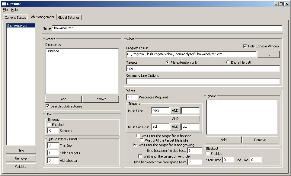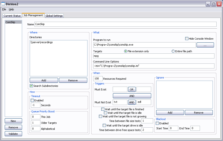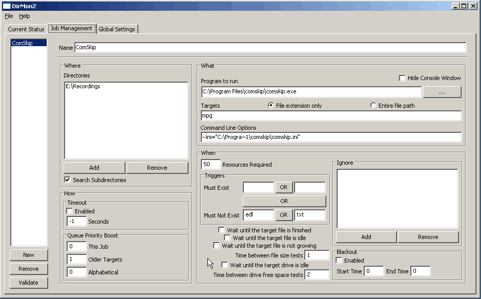 I also had two separate computers to do either comskipping or running showanalyzer, before I got a fast dual-core, which can run showanalyzer at any time without degrading my SageTV performance. I have a suggestion for the DirMon2 configuration and a method to run comskip.exe on your SageTV computer without killing the SageTV performance. I noticed that your "must exist" does not have the "mpg" parameter. I included a screenshot of my DirMon2 configuration. If you want to run comskip on the same SageTV computer, but cannot because it consumes too much CPU, you might consider dropping the priority of comskip.exe down to "Low". There are a couple of ways to do it, by running a batch file to start comskip.exe or a utility from www.beyondlogic.org. To drop the priority of comskip.exe with a startup batch file, the syntax is: start comskip.exe /low If you use the free utility, "process.exe" from www.beyondlogic.com, after comskip.exe is running, the syntax is: process -p comskip.exe low The priority options are: Low BelowNormal Normal AboveNormal High Realtime When I ran an Althon XP 2800+ CPU, I was able to run comskip at "low" priority. It made a huge difference. The CPU will still be consumed at high levels, but the comskip.exe process will yield the CPU resources for other things. The comskip.exe will take longer to run at "low" priority, but maybe it would be a better alternative for you than using many computers to offload the workload from your SageTV computer. In the old punchcard days, I used to run batch jobs, and they are still around! A batch job like comskip.exe should not need to run at the same priority as "interactive" jobs or processes. I think you'll be surprised how well comskip.exe will work on your main SageTV computer when you run comskip.exe at "low" priority - it won't consume all your CPU without yielding resources to more important tasks. Dave |