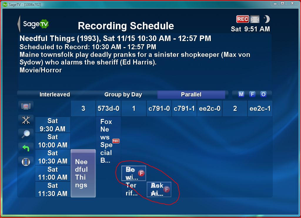 I am seeing some type of display issue when I view the recording schedule in parallel mode. I see this on the server, client and even using the HD extender. It looks like multiple entries are sometimes displayed over one another. See the circled entries in the attached snip. The 11 AM entry for bewitched is OK and shown as being on tuner c791-0 when the number of columns is less than 6. The 11:30 problems appear to be two recordings Bewitched (ee2c-0) and Ask Aida (2). The 11:30 problems appear when I have 3 or more columns displayed. Anyone else seeing this type or problem? I will probably report to support on Monday.