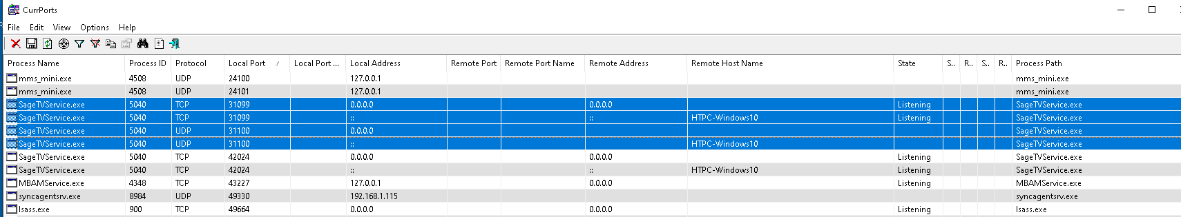 I will admit that I have a fairly complicated setup. The 10 HDHomeRun tuners are connected to the LAN. The Server is connected to the LAN. The HD300 is connected to the LAN and to/from a Yamaha RX A3080 AVR. I am unsure where I should look for a disruption that would affect only SageTV. (I have swapped cables and switch inlet port with the ROKU unit with no change.) Any suggestions? And to the other issue: I can access the Tuners with a variety of programs on the Server machine. The only thing using the two Ports are SageTVService.EXE. (See attached) SageTV Ports.PNG |